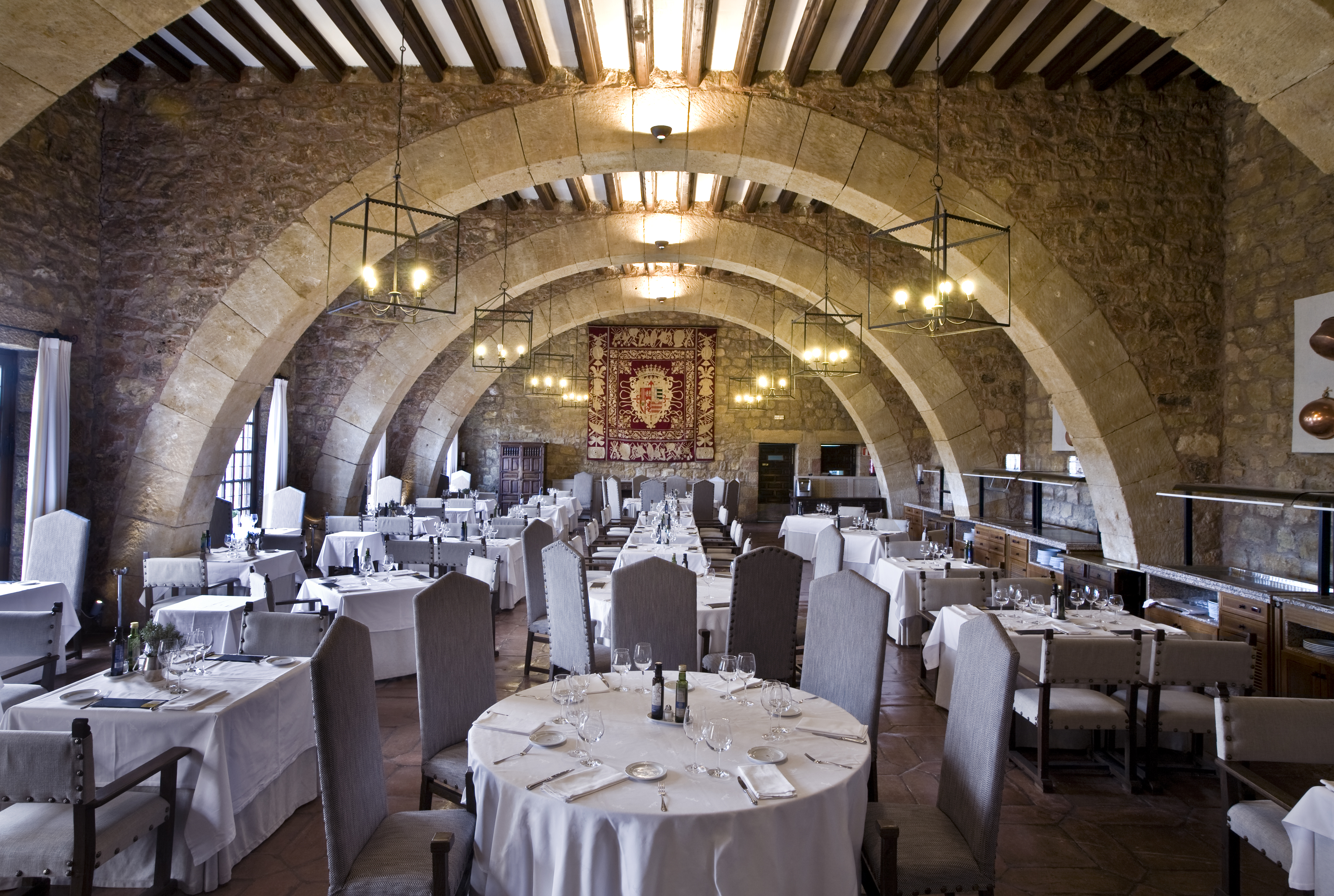The Parador de Siguenza is a unique hotel experience which gives guests the opportunity to stay in a stunning hilltop castle. The Castle of the Bishops of Siguenza is an imposing medieval castle with foundations dating back to the 5th century. Throughout the years it has been held and added to by the Visigoths, Moors and Christians. The fortress was converted to an episcopal palace in the late 18th century, adding additional windows and balconies, however it was abandoned in the 1830s after being damaged by war and fire. The building was rescued and converted to a luxury Parador hotel in 1978 and offers comfortable accommodation in a slice of Spanish history. Many of the buildings original features and ambience have been retained, with the huge lounge being particularly remarkable. Converted from the castle’s original dining hall, this room has high ceilings with chandeliers, huge banners adorning the walls and suits of armour. Guestrooms are spacious and welcoming, and many of them have canopy beds and balconies. The restaurant boasts a stately and elegant dining room with magnificent views of the surrounding farmland and Pinar de Siguenza, the nearby pine wood. Dishes are made using the finest local and seasonal ingredients with specialities including oven-roasted lamb, cod, manchego cheese and borrachitos seguntinos for dessert (delicious sponge cake soaked in liqueur syrup). Visitors in October and November should be sure to try dishes featuring the delicious mushrooms from the region. The Parador also hosts themed dinners which accompany events such as opera and zarzuela (Spanish opera) shows. We recommend including the Parador de Siguenza as part of a Spanish touring holiday. Its location makes it ideal as a stopover between Central Spain and the Basque Country whilst train services to Madrid and Barcelona allow easy inclusion within a rail tour.